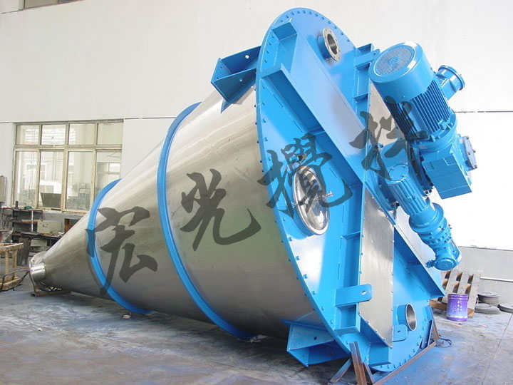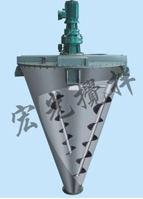 單錐雙螺旋錐形混合機(jī),它由傳動部分、筒蓋、螺旋、筒體、出料閥等組成。