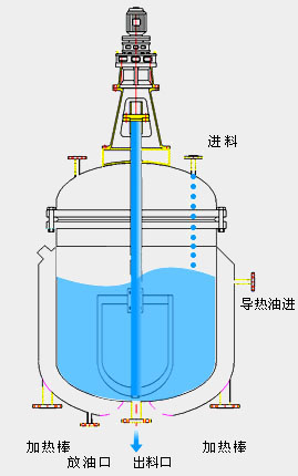 攪拌罐蓋上部配置有傳動裝置(電機或減速器),由傳動軸驅(qū)動攪拌罐內(nèi)的攪拌器。